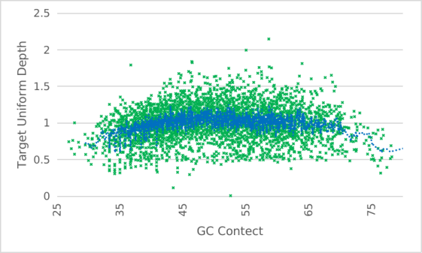 | 案例(以NA12878樣本為模板進行建庫,均一化深度后,不同GC含量區(qū)域具有良好均一) | ||||