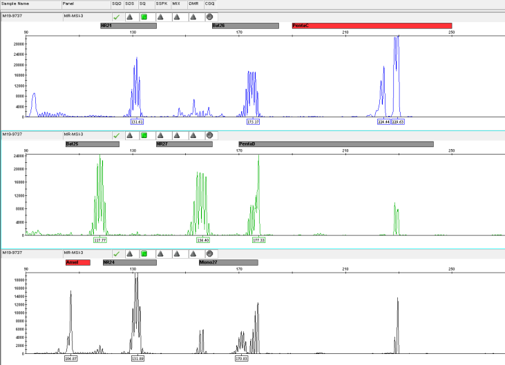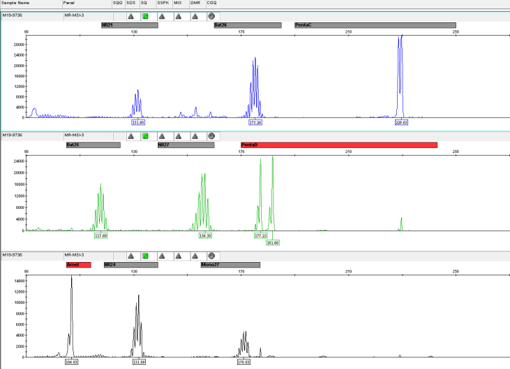 微衛(wèi)星是人類基因組的一段串聯(lián)重復(fù)序列,一般在1~6bp之間,又被稱作短串連重復(fù)(Short Tandem Repeats,STRs)或簡單重復(fù)序列(Simple Sequence Repeat,SSRs)。 微衛(wèi)星不穩(wěn)定(Microsatellite Instability,MSI)指的是微衛(wèi)星重復(fù)次數(shù)減少或者增加,微衛(wèi)星不穩(wěn)定的內(nèi)在機(jī)制是錯(cuò)配修復(fù)(MMR)系統(tǒng)失調(diào),從而限制了糾正微衛(wèi)星自發(fā)的長度改變的體細(xì)胞突變的能力,體細(xì)胞突變積累,最終形成MSI。