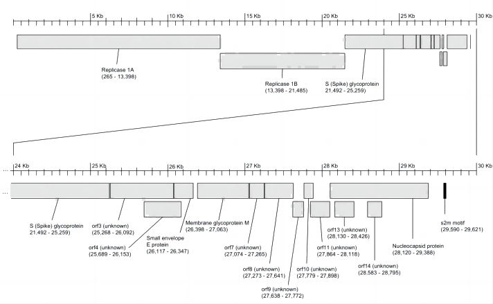 Severe acute respiratory syndrome (SARS)于2003年二月在亞洲第一次被報道,繼而傳播到全球十幾個國家,SARS屬于一種冠狀病毒,是一類具有囊膜、基因組為線性單股正鏈的RNA病毒,對應的結構示意圖如下: