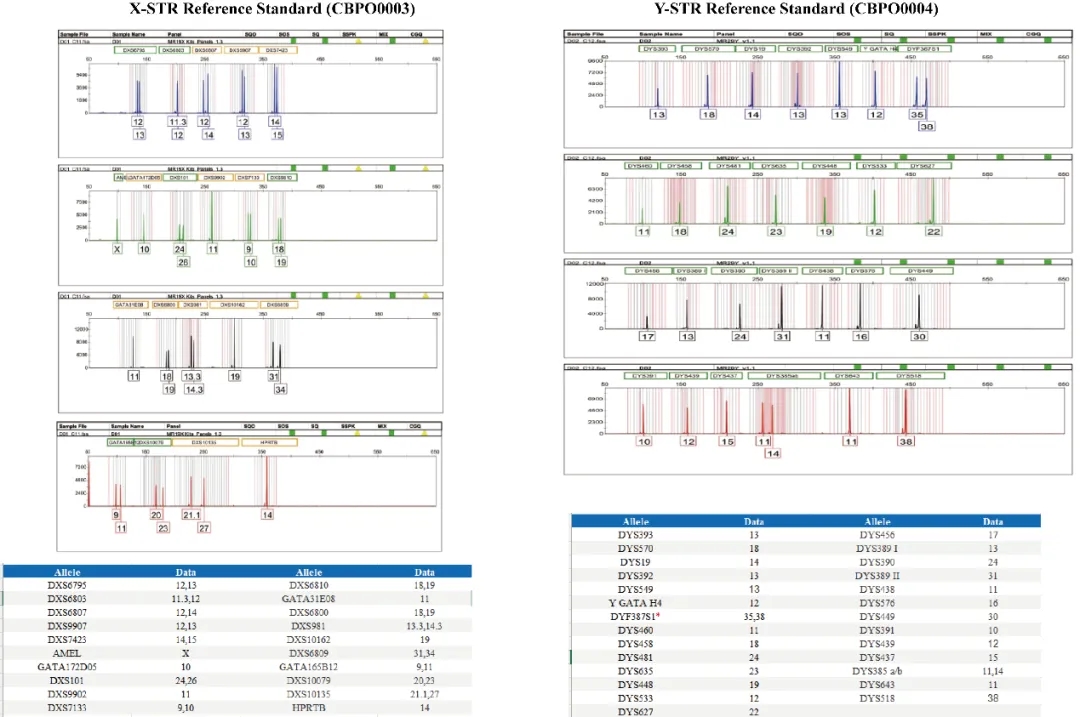 X染色體標(biāo)準(zhǔn)品包含19個(gè)X-STR基因座和一個(gè)性別位點(diǎn)Amelogenin。Y染色體標(biāo)準(zhǔn)品包含22個(gè)低頻突變Y-STR基因座和7個(gè)高頻突變Y-STR基因座。低頻突變和高頻突變基因座相結(jié)合具有更高的個(gè)體識(shí)別能力,提供了強(qiáng)大的兼容性和排查能力。