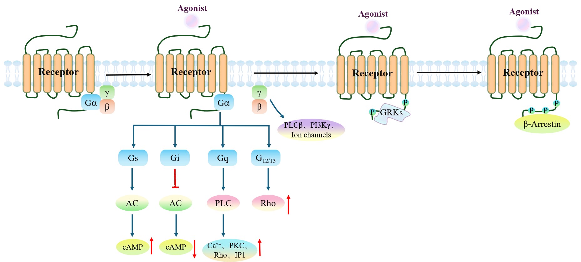 人類GPCR家族根據(jù)其氨基酸序列分為A類(視紫紅質(zhì))、B類(分泌素和粘附)、 C類(谷氨酸鹽)和F類(Frizzled)亞家族。A類GPCRs是由719個(gè)成員組成的視紫紅質(zhì)樣受體家族,分為幾個(gè)亞類:胺類、肽類、蛋白質(zhì)類、脂質(zhì)類、褪黑素類、核苷酸類、類固醇類、糖羧酸類、感覺類和孤兒類。A類GPCRs的適應(yīng)癥包括止痛藥、過(guò)敏、心血管疾病、高血壓、癌癥等。