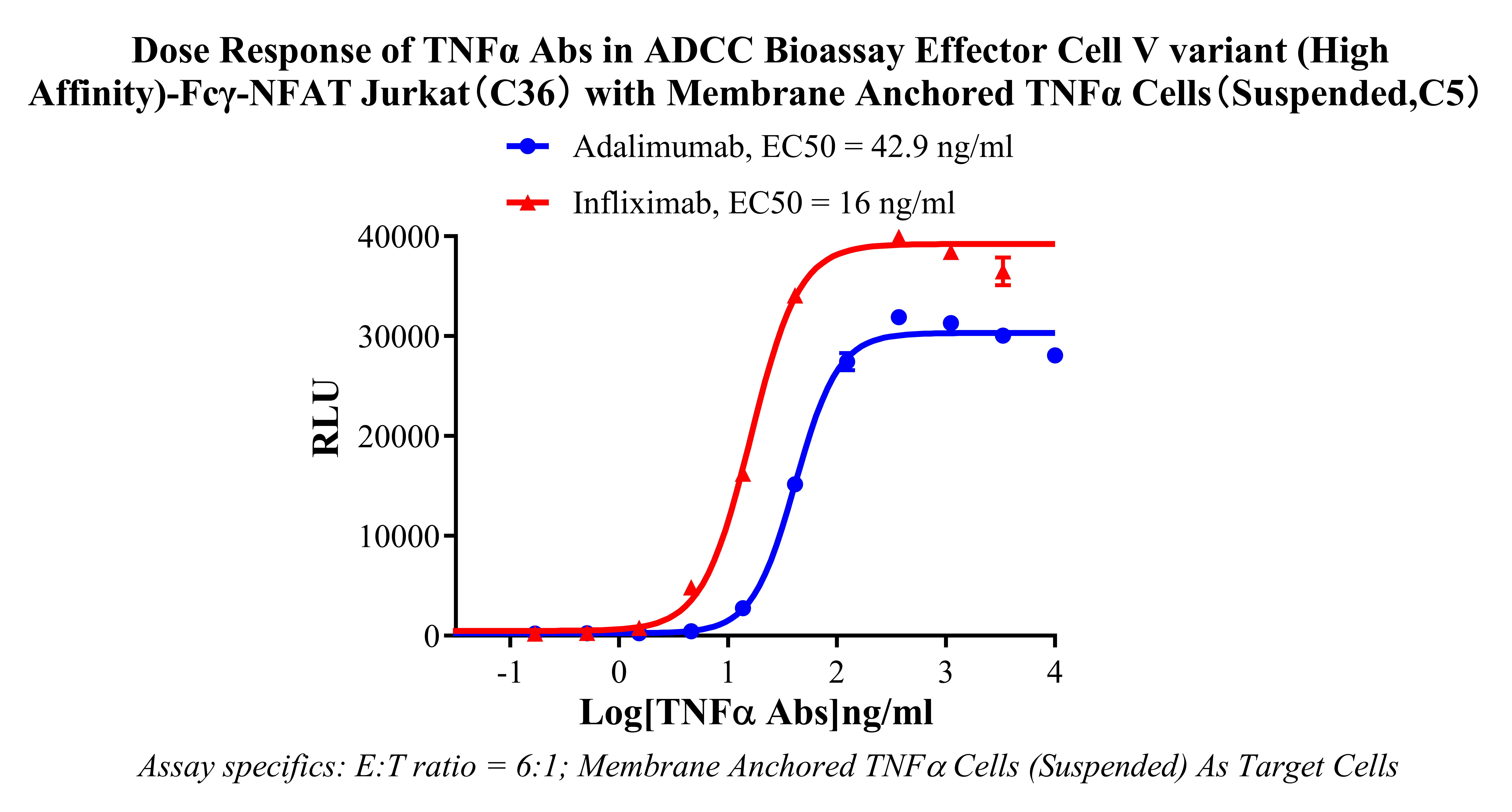 Figure 2. Dose response of TNFα Abs in ADCC Bioassay Effector Cell (High Affinity)-Fcγ-NFAT Jurkat (C36) With Membrane Anchored TNFα Cell (Suspended, C5).