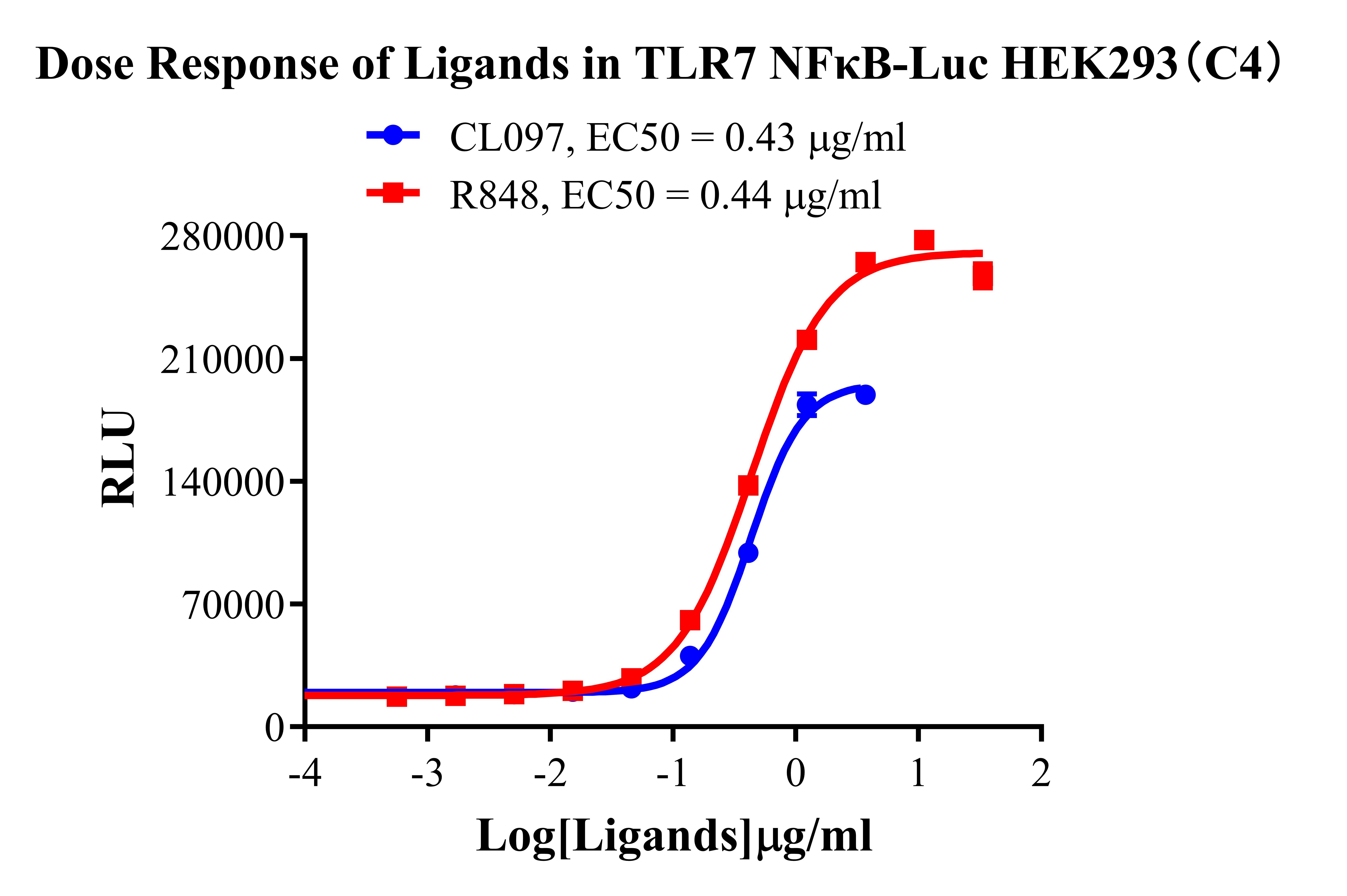 Figure 2.Detect Luciferase assay by Ultra Luciferase Detection Kit CBPH0001(we strongly suggest to purchase from Cobioer). Dose Response of Ligands in TLR7 NFκB HEK293(C4).