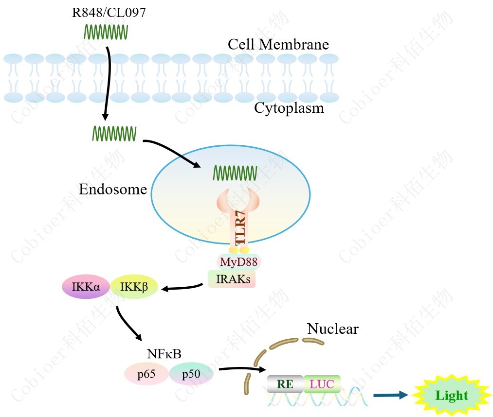 TLR7 NFκB-Luc HEK293 報(bào)告基因藥靶模型很好的模擬了體內(nèi) TLR7 的信號轉(zhuǎn)導(dǎo)過程, 原理見下圖所示。