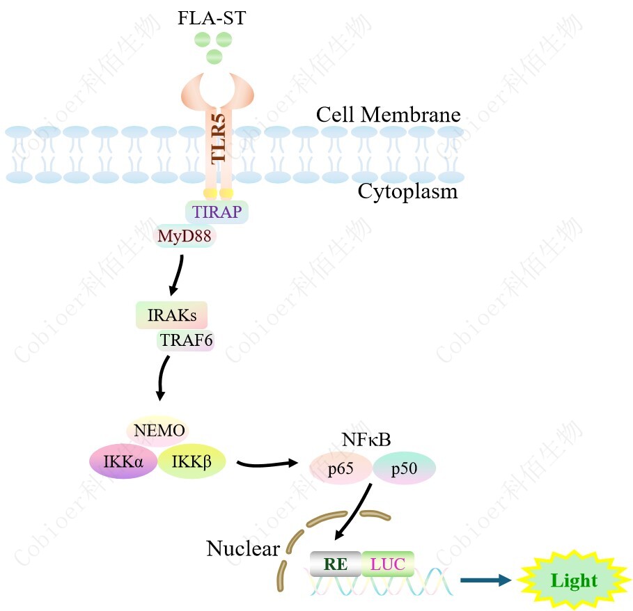 TLR5 NFκB-Luc HEK293 報(bào)告基因藥靶模型很好的模擬了體內(nèi) TLR5 的信號(hào)轉(zhuǎn)導(dǎo)過程, 原理見下圖所示。