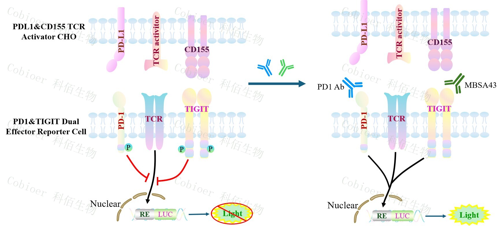 PDL1&CD155 TCR Activator CHO 作為 PD1&TIGIT Dual Effector Reporter Cell 的靶細 胞,很好的模擬了體內(nèi) PD1&TIGIT 的信號轉(zhuǎn)導過程,原理見下圖所示。
