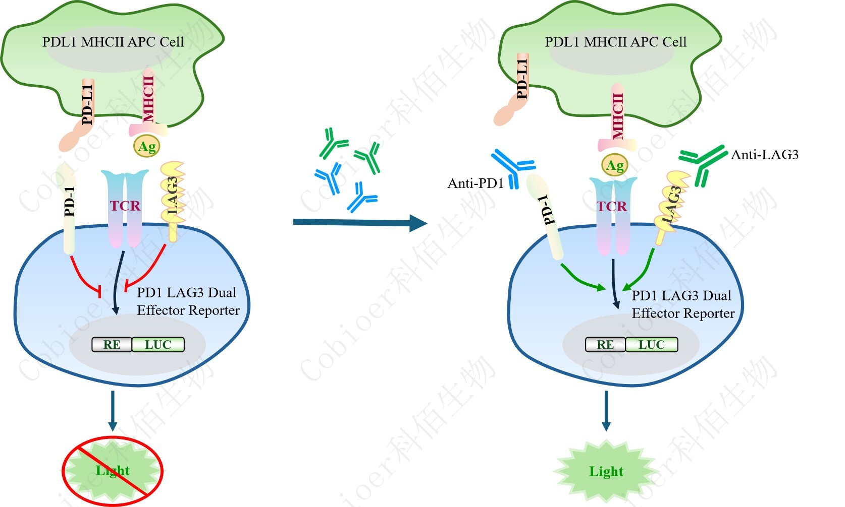 PD1 LAG3 Dual Effector Reporter Cell 報告基因藥靶模型很好的模擬了體內(nèi) PD1&LAG3 的信號轉(zhuǎn)導過程,原理見下圖所示。![]() Figure 1. PD1 LAG3 Dual Effector Reporter Cell 細胞模型原理圖 |