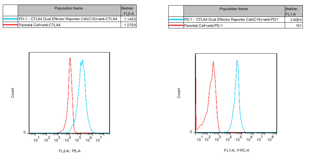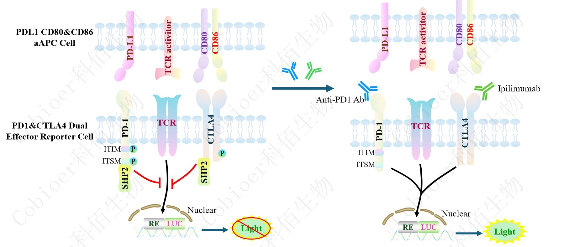 PD1&CTLA4 Dual Effector Reporter Cell 報(bào) 告 基 因 藥 靶 模 型 很 好 的 模 擬 了 體 內(nèi) PD1&CTLA4 的信號轉(zhuǎn)導(dǎo)過程,原理見下圖所示。