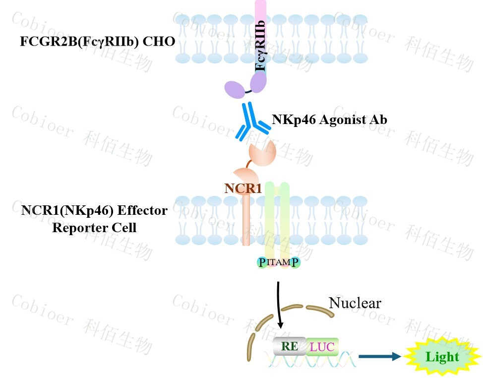 NCR1(NKp46) Effector Reporter 報告基因藥靶模型很好的模擬了體內(nèi) NKp46 的信號轉 導過程,原理見下圖 所示。![]() Figure 1. NCR1(NKp46) Effector Reporter 細胞模型原理圖