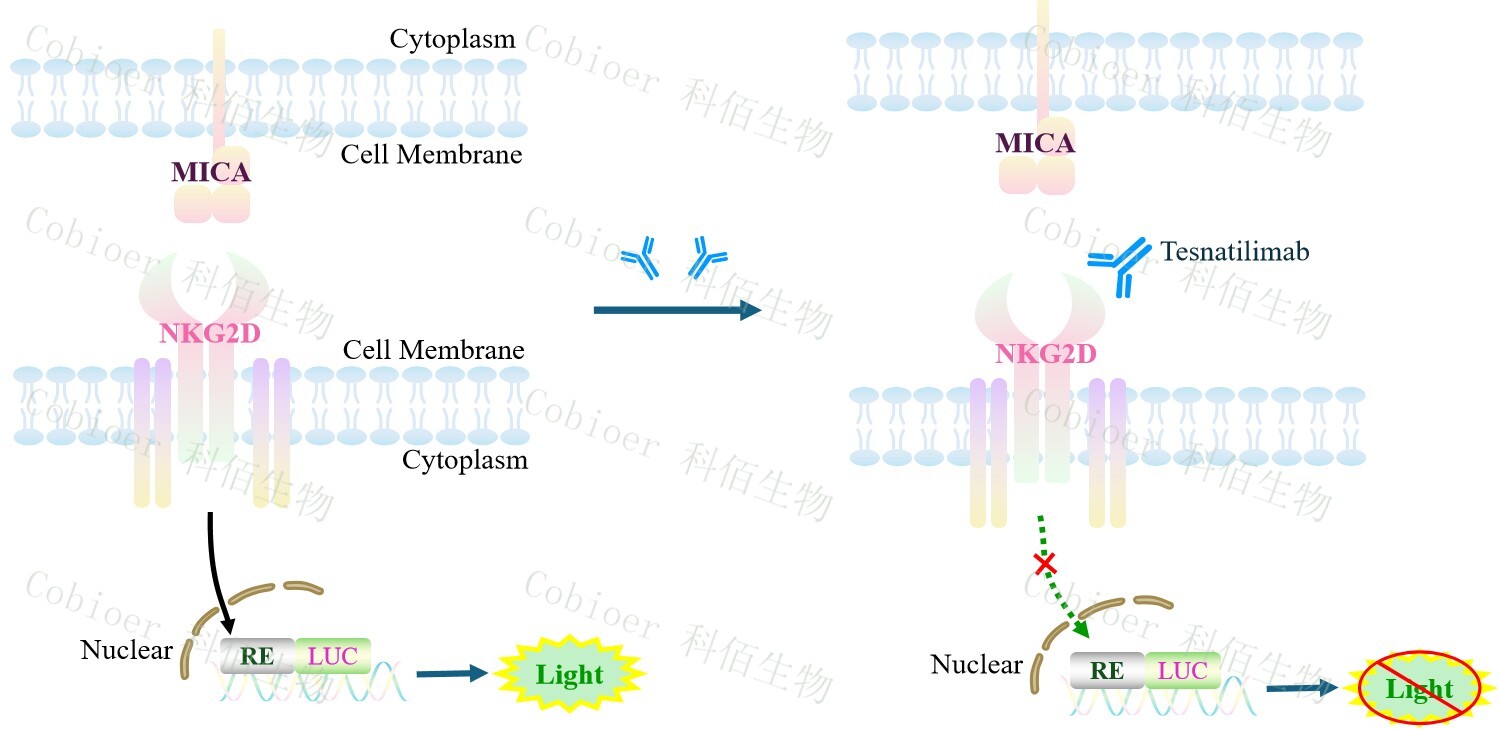MICA CHO 作為 NKG2D Effector Reporter Cell 的靶細胞,很好的模擬了體內(nèi) NKG2D 的信號轉(zhuǎn)導過程,原理見下圖所示。![]() Figure 1. MICA CHO 細胞構(gòu)建原理圖 |