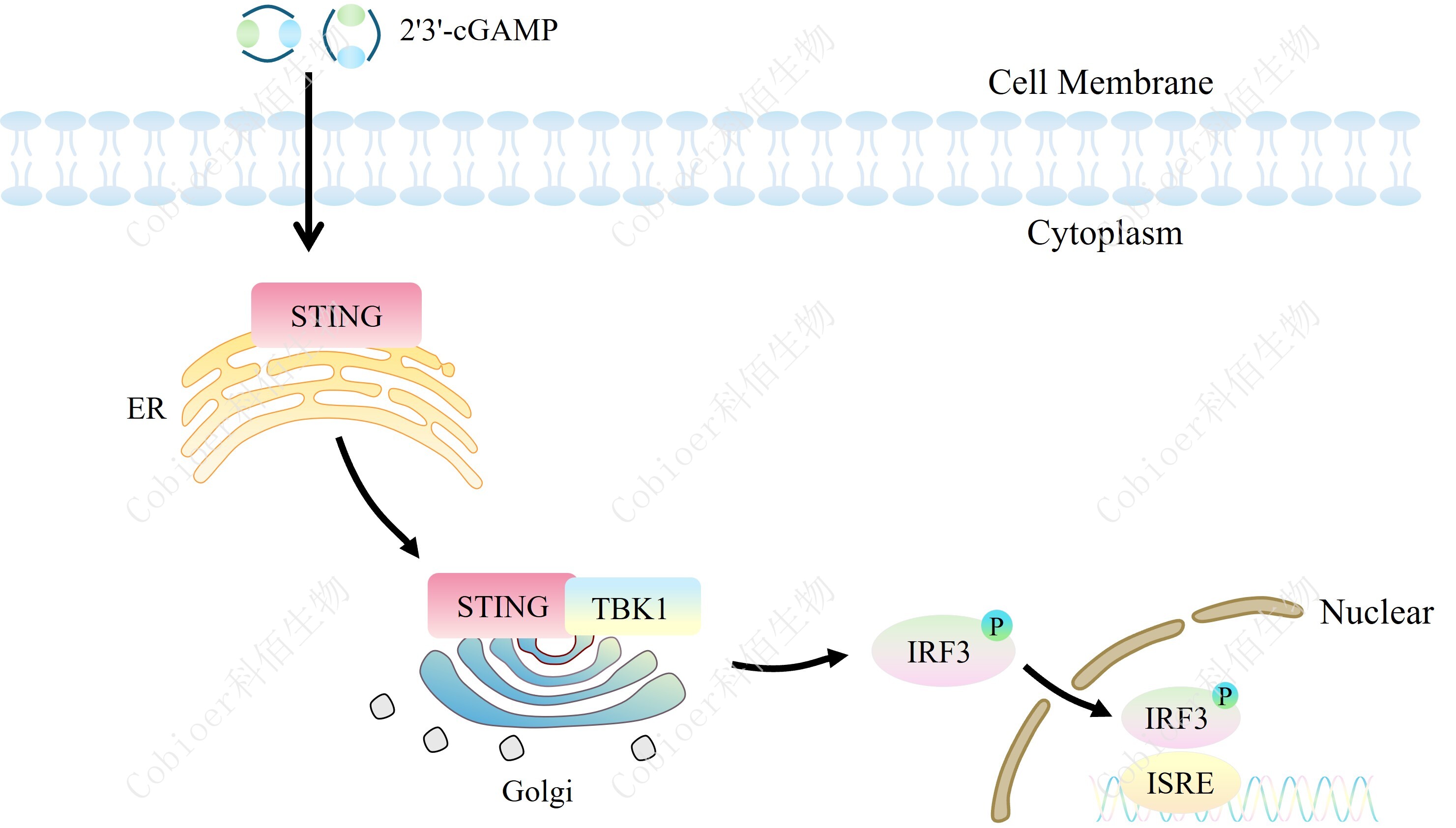 ISRE-Luc RAW264.7 報(bào)告基因細(xì)胞是由 ISRE 調(diào)控并表達(dá) Luc 熒光素 酶報(bào)告基因的 RAW264.7細(xì)胞。RAW264.7 是小鼠巨噬細(xì)胞的常用模型,用于研究細(xì)胞對(duì)微 生物及其產(chǎn)物的反應(yīng)。RAW 264.7 衍生細(xì)胞內(nèi)源性表達(dá)許多 PRR,包括 toll 樣受體 (TLR)、 NOD 樣受體 (NLR)、RIG-I 樣受體 (RLR) 和 C 型凝集素受體 (CLR)。STING 激活的 原理見(jiàn)下圖所示。