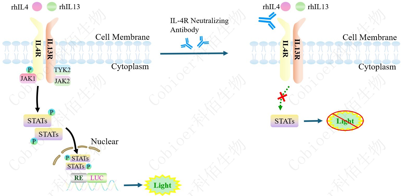 IL4/IL13 Effector Reporter Cell 報(bào)告基因藥靶模型很好的模擬了體內(nèi) IL4/IL13 的信號(hào)轉(zhuǎn) 導(dǎo)過程,原理見下圖所示。