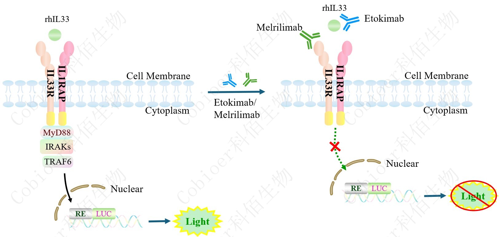 IL33 Effector Reporter Cell 報(bào)告基因藥靶模型很好的模擬了體內(nèi) IL33 的信號(hào)轉(zhuǎn)導(dǎo)過程, 原理見下圖所示。 Figure 1. IL33 Effector Reporter Cell 細(xì)胞模型原理圖 |