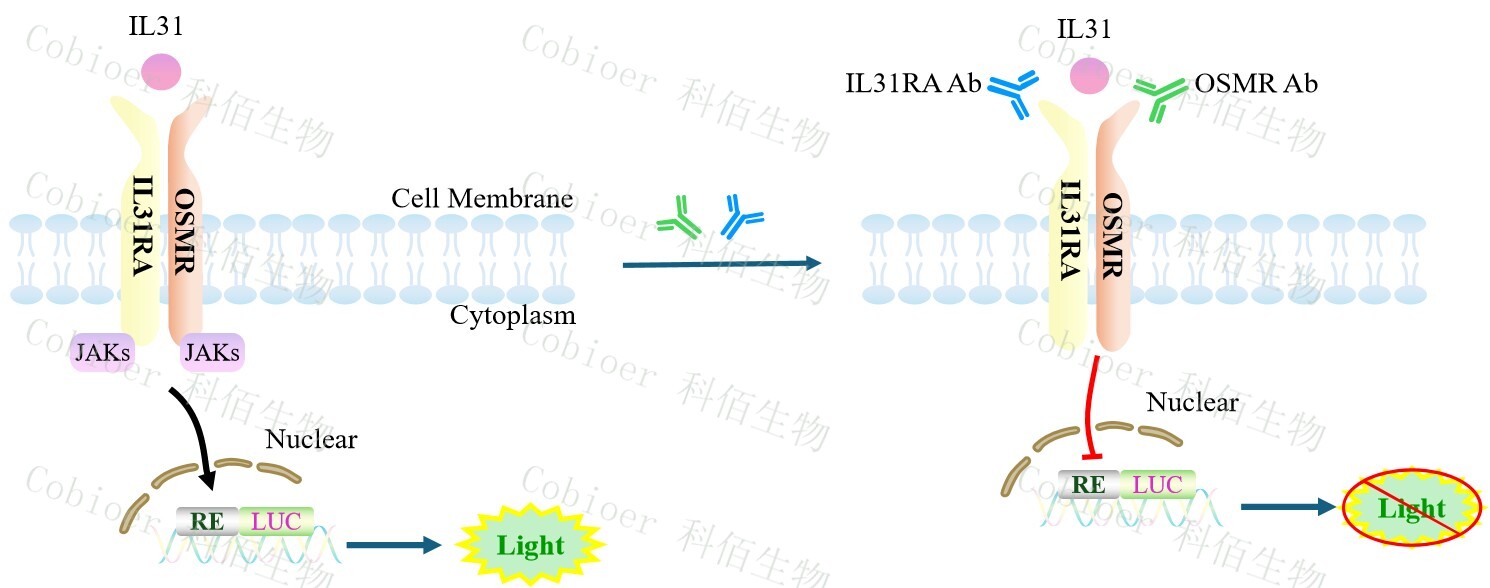 IL31 Effector Reporter報告基因藥靶模型很好的模擬了體內(nèi) IL31的信號轉(zhuǎn)導(dǎo)過程,原理見下圖所示。![]() Figure 1. IL31 Effector Reporter Cell 細(xì)胞模型原理圖