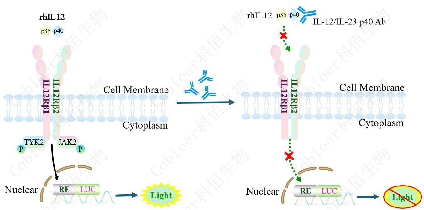 IL12 Effector Reporter Cell 報(bào)告基因藥靶模型很好的模擬了體內(nèi) IL12 的信號(hào)轉(zhuǎn)導(dǎo)過(guò)程, 原理見(jiàn)下圖所示。 ![]() Figure 1. IL12 Effector Reporter Cell 細(xì)胞模型原理圖 |