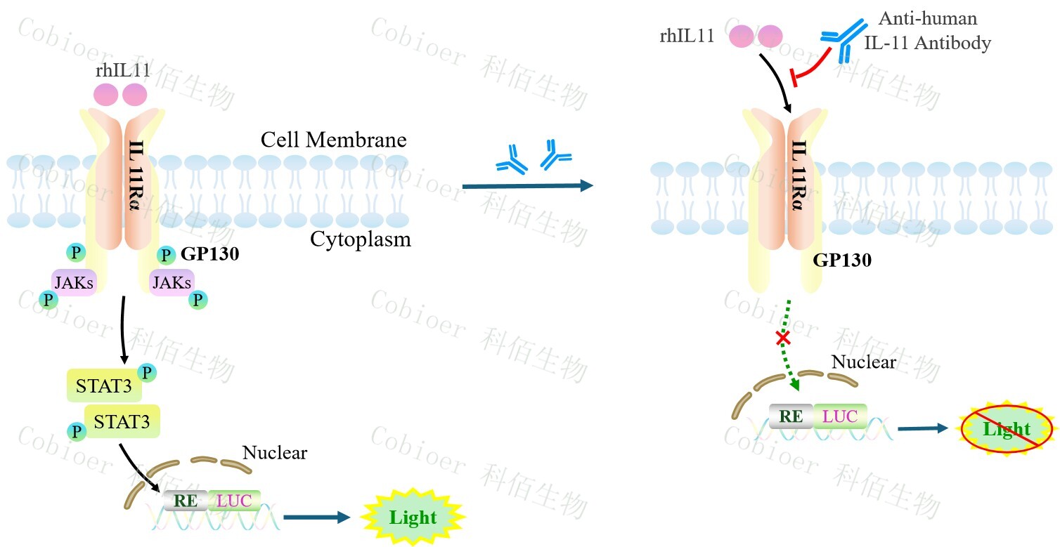 IL11 Effector Reporter Cell 報告基因藥靶模型很好的模擬了體內(nèi) IL11 的信號轉(zhuǎn)導過程, 原理見下圖所示。![]() Figure 1. IL11 Effector Reporter Cell 細胞模型原理圖 |