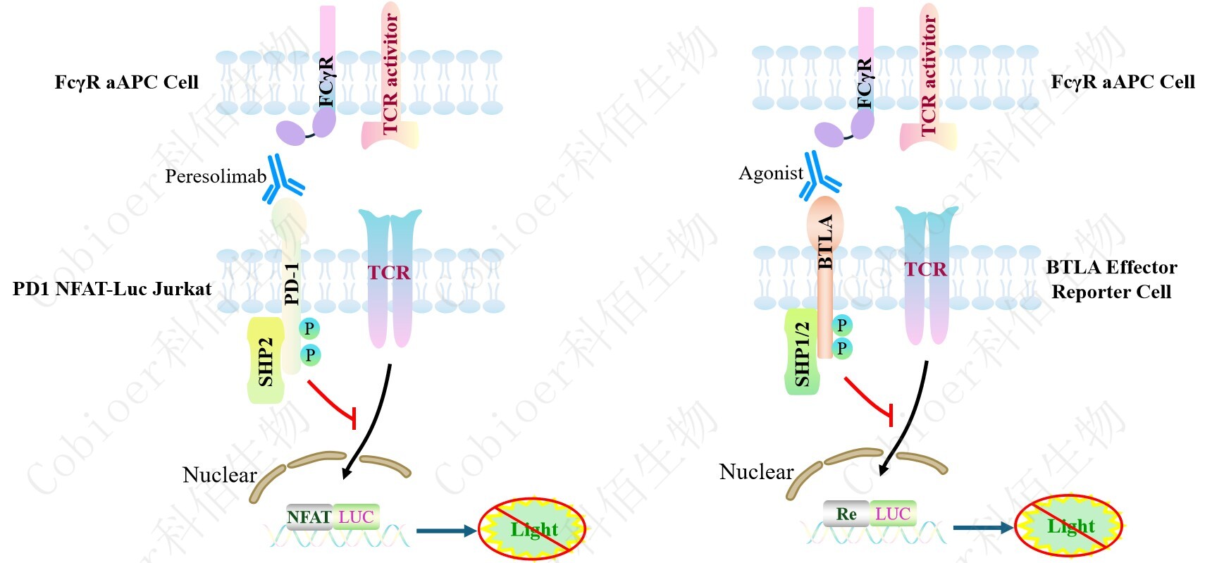 FcγR aAPC Cell在基礎細胞上穩(wěn)定表達 FcγR 和 aAPC。FcγR aAPC Cell 作為 PD1 NFAT-Luc Jurkat Cell/BTLA Effector Reporter Cell 的靶細胞進行功能檢測的原 理圖見下圖所示。![]() Figure 1. FcγR aAPC Cell 的原理圖 |