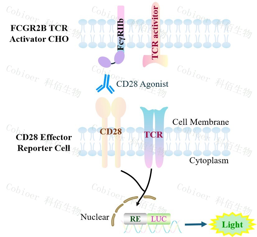 CD28 Effector Reporter Cell 報告基因藥靶模型很好的模擬了體內(nèi) CD28 的信號轉(zhuǎn)導過 程,原理見下圖所示。 ![]() Figure 1. CD28 Effector Reporter Cell 細胞模型原理圖 |