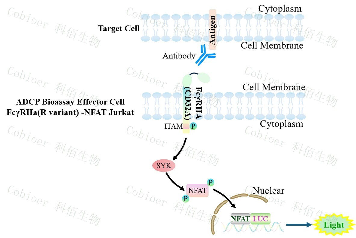 ADCP Bioassay Effector Cell FcγRIIa(R variant) -NFAT Jurkat 報(bào)告基因藥靶模型很好的 模擬了體內(nèi) ADCP 的信號轉(zhuǎn)導(dǎo)過程,原理見下圖所示。