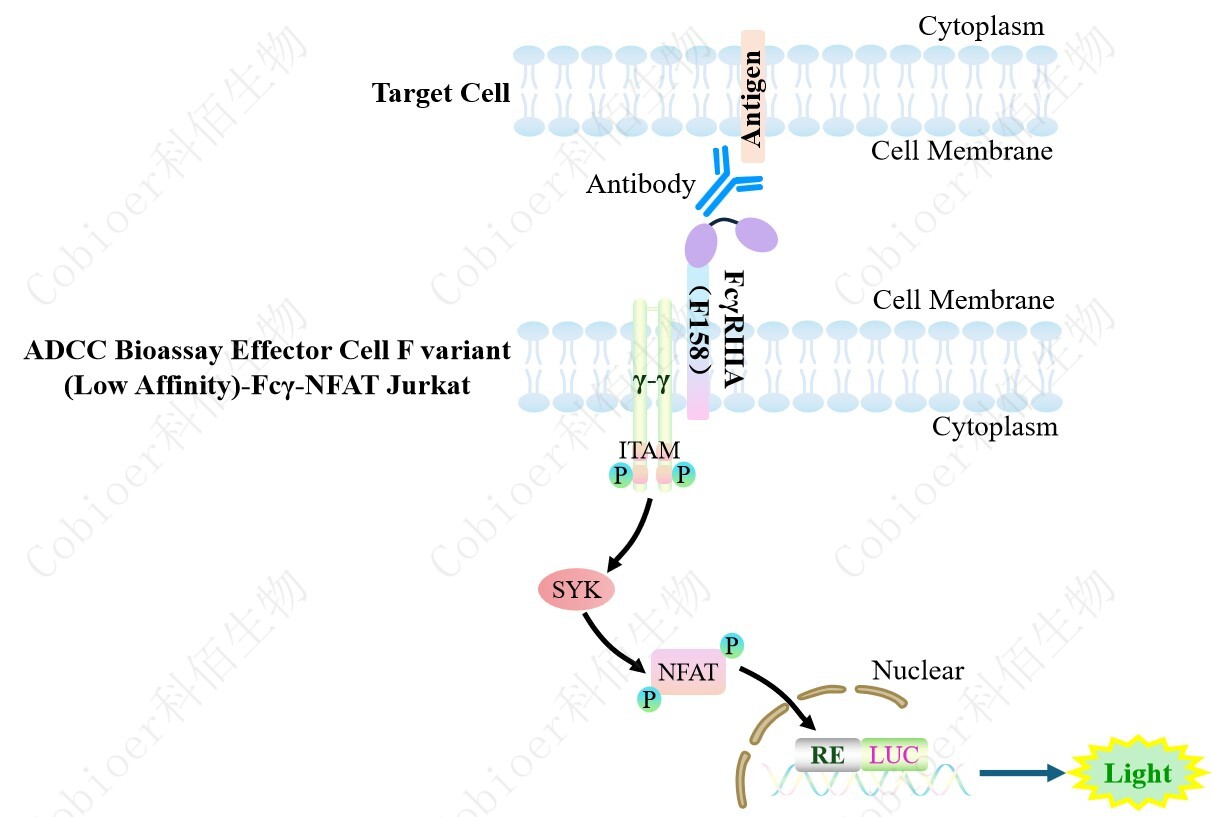 ADCC Bioassay Effector Cell F variant (Low Affinity)-Fcγ-NFAT Jurkat 報(bào)告基因藥靶模型 很好的模擬了體內(nèi) ADCC 的信號轉(zhuǎn)導(dǎo)過程,原理見下圖所示。