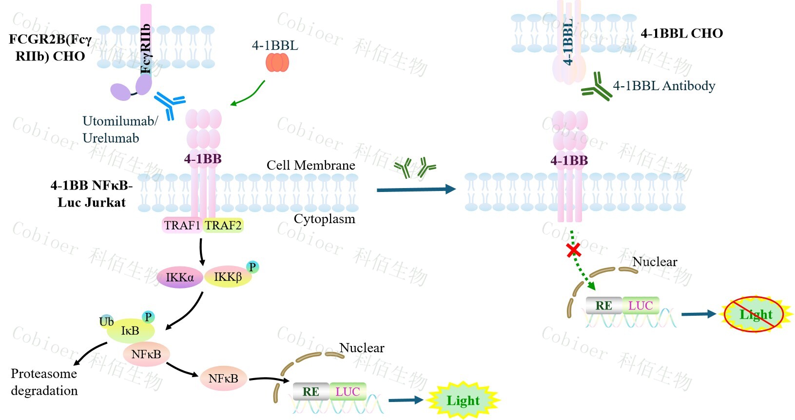 4-1BB NFκB-Luc Jurkat 報(bào)告基因藥靶模型很好的模擬了體內(nèi) 4-1BB 的信號(hào)轉(zhuǎn)導(dǎo)過(guò)程, 原理見下圖所示。