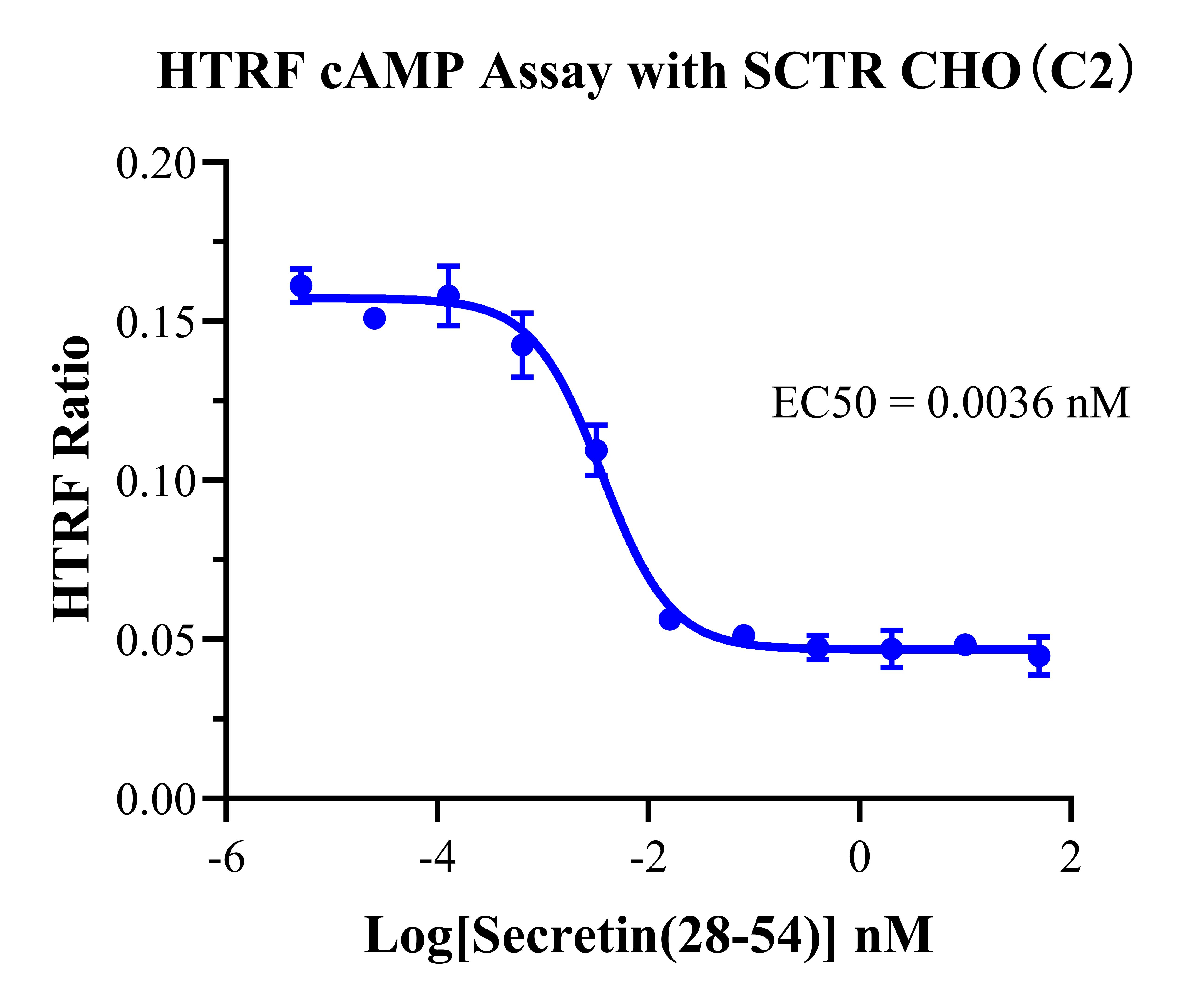 cAMP 在 G 蛋白偶聯(lián)受體(GPCR)信號轉(zhuǎn)導中是一種關鍵的第二信使。當配體結(jié)合到 GPCR, 構(gòu)象發(fā)生變化,激活受體接著激活 G 蛋白,Gs 的激活導致腺苷酸環(huán)化酶調(diào)控 cAMP 的升高。 SCTR 藥靶模型很好的模擬了體內(nèi) SCTR 的信號轉(zhuǎn)導過程,原理見下圖所示。 |