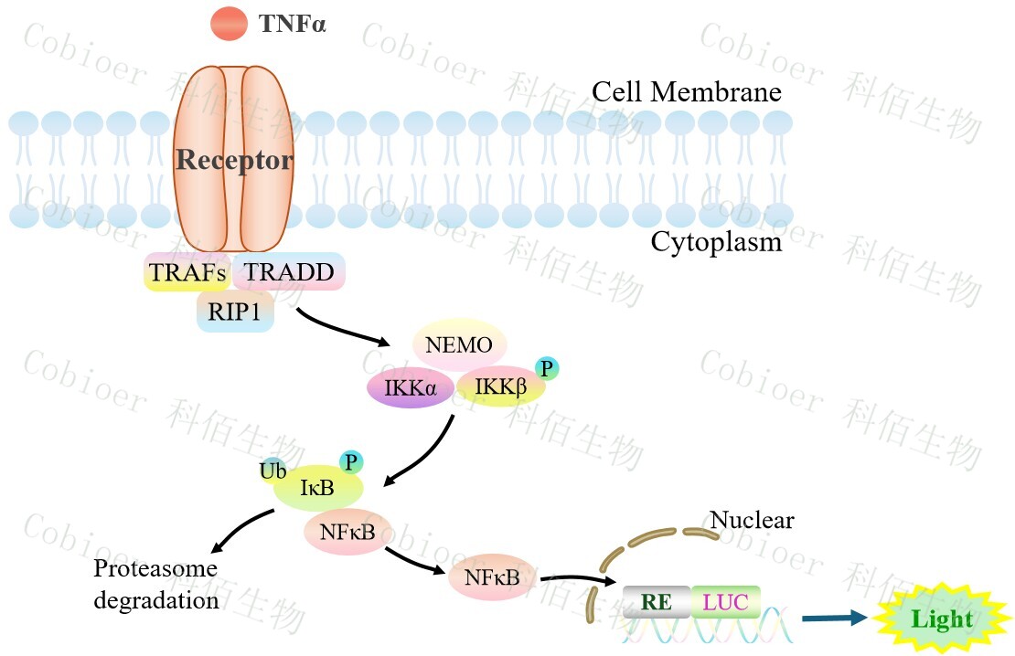 NFκB-Luc THP-1 報(bào)告基因細(xì)胞是由 NFκB 調(diào)控并表達(dá) Luc 熒光素酶報(bào) 告基因的 THP-1 細(xì)胞。TNFα 與受體結(jié)合,激活 NF-κB 的原理見下圖所示。![]() Figure 1. NFκB-Luc THP-1 細(xì)胞模型原理圖