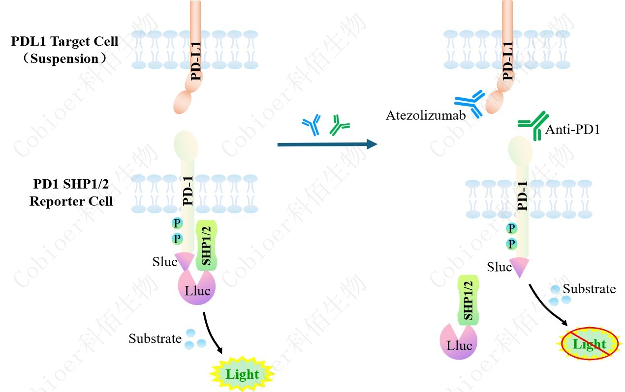 PDL1 Target Cell(Suspension)作為 PD1 SHP1 Reporter Cell 和 PD1 SHP2 Reporter Cell 的靶細(xì)胞,藥靶模型很好的模擬了體內(nèi) PD1&SHP1/SHP2 的信號轉(zhuǎn)導(dǎo)過程,原理見下圖所 示。![]() Figure 1. PDL1 Target Cell(Suspension)模型原理圖 |
