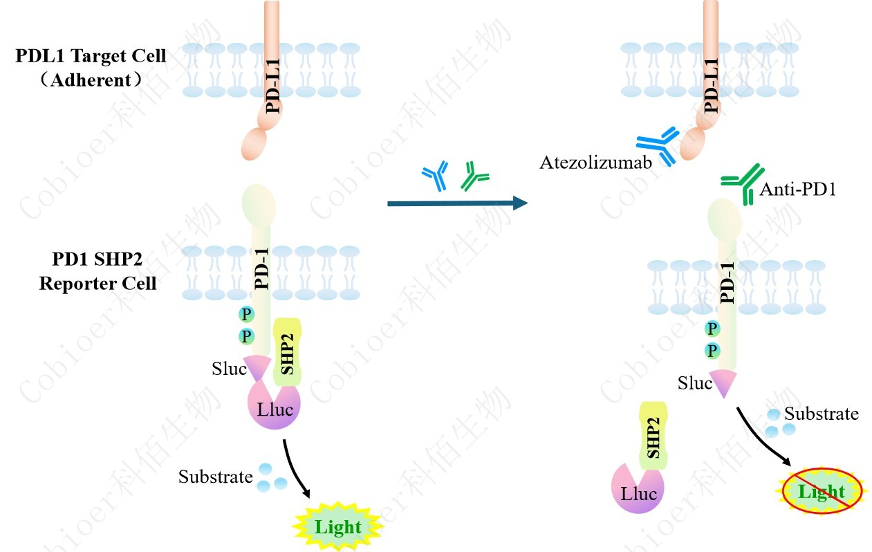 PDL1 Target Cell(Adherent)作為 PD1 SHP2 Reporter Cell 的靶細(xì)胞,藥靶模型很好的 模擬了體內(nèi) PD1&SHP2 的信號(hào)轉(zhuǎn)導(dǎo)過程,原理見下圖所示。![]() Figure 1. PDL1 Target Cell(Adherent)模型原理圖 |