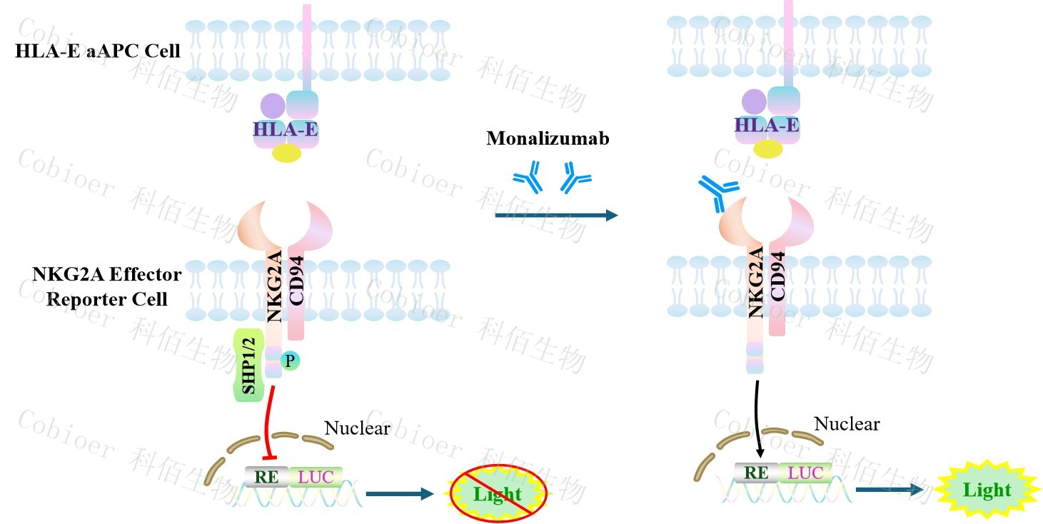 NKG2A Effector Reporter Cell 報告基因藥靶模型很好的模擬了體內(nèi) NKG2A 的信號轉(zhuǎn)導過程,原理見下圖所示。