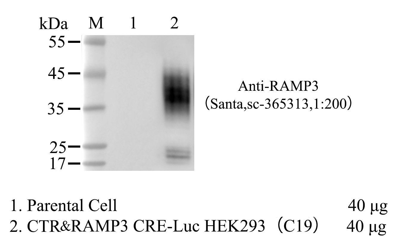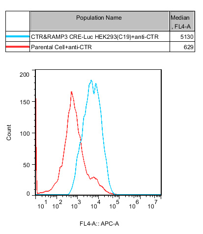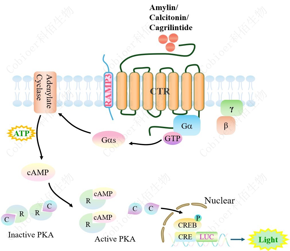 CTR&CTR&RAMP3 CRE-Luc HEK293 報(bào)告基因藥靶模型很好的模擬了體內(nèi) CTR 的信號(hào)轉(zhuǎn)導(dǎo) 過程,原理見下圖所示。![]() Figure 1. CTR&RAMP3 CRE-Luc HEK293 細(xì)胞模型原理圖 |