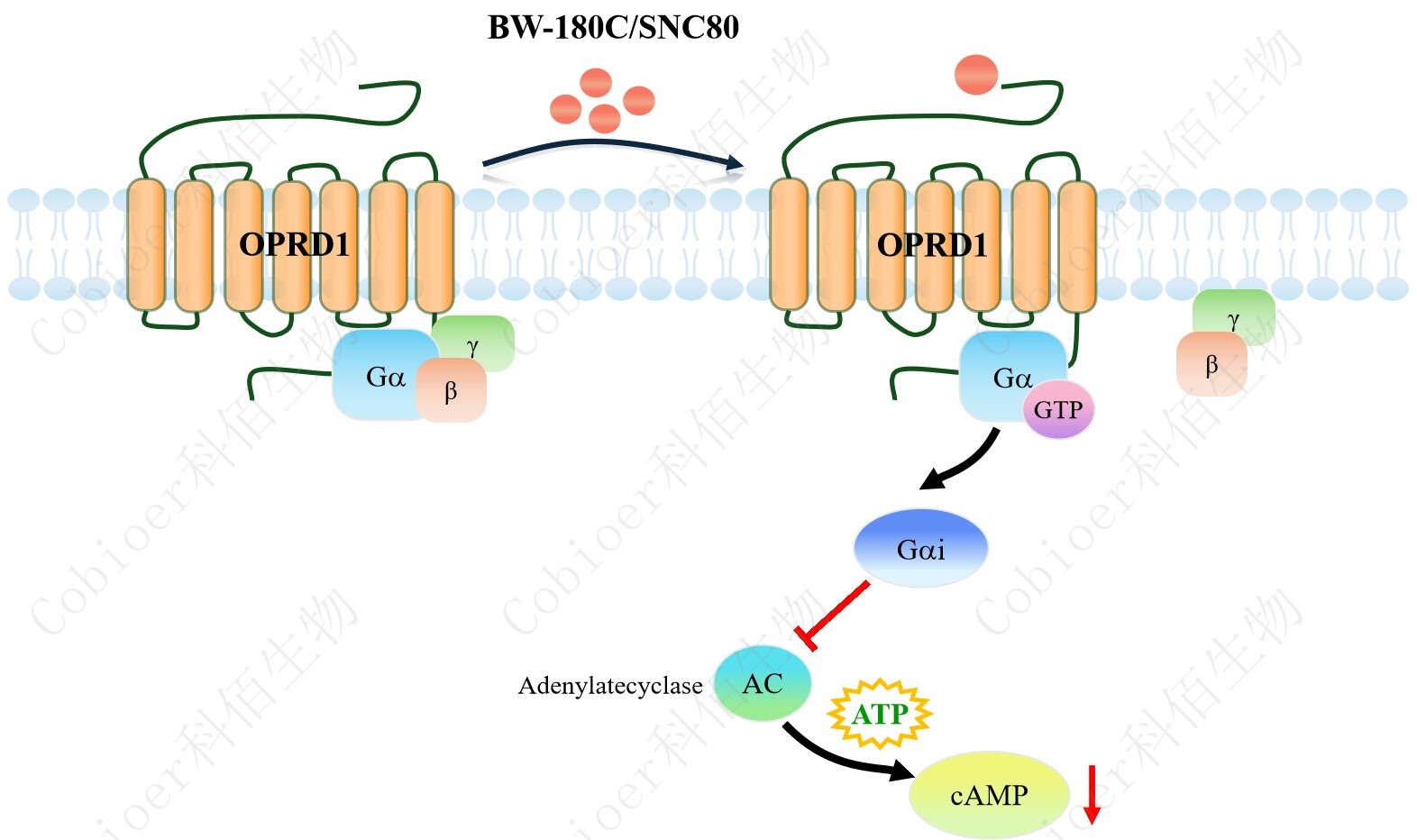 cAMP 在 G 蛋白偶聯(lián)受體(GPCR)信號(hào)轉(zhuǎn)導(dǎo)中是一種關(guān)鍵的第二信使。當(dāng)配體結(jié)合到 GPCR,構(gòu)象發(fā)生變化,激活受體接著激活 G 蛋白,Gi 的激活導(dǎo)致腺苷酸環(huán)化酶調(diào)控 cAMP 的下調(diào)。OPRD1 CHO 藥靶模型很好的模擬了體內(nèi) OPRD1 的信號(hào)轉(zhuǎn)導(dǎo)過(guò)程,原理見(jiàn)下圖所示。 |
