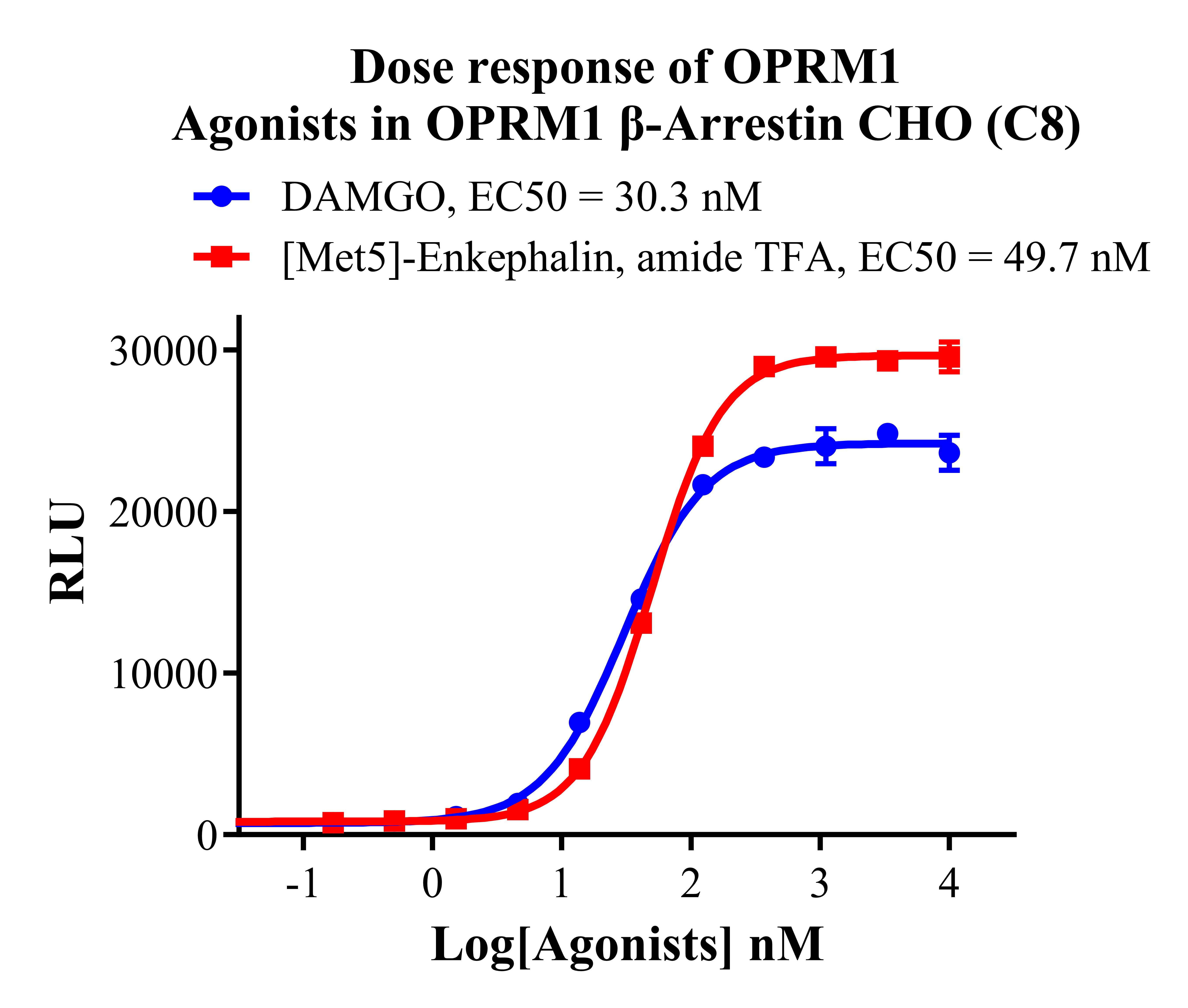 OPRM1 β-Arrestin CHO 報告基因藥靶模型很好的模擬了體內(nèi) OPRM1/β-Arrestin 的信號 轉(zhuǎn)導過程,原理見下圖所示。當缺乏配體刺激時,β-Arrestin 不與 OPRM1 結(jié)合,融合β- Arrestin 的熒光素酶處于失活構象,當 OPRM1 遭遇配體刺激時,融合熒光素酶報告基因的 β-Arrestin 被招募,使熒光素酶報告基因處于激活狀態(tài),加入其底物后發(fā)光信號增強。 |