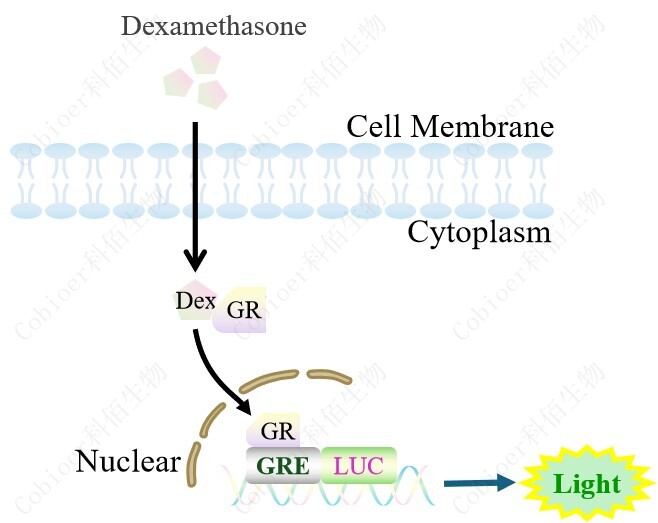 GRE-Luc A549 報告基因細胞,是由 GRE 調(diào)控并表達 Luc 熒光素酶報告 基 因的 A549 細 胞。 Dexamethasone (Hexadecadrol, 地 塞米 松)是 糖皮質(zhì)激素受體 (Glucocorticoid Receptor)激動劑、凋亡誘導劑,原理見下圖所示。![]() Figure 1. GRE-Luc A549 細胞原理示意圖 |
