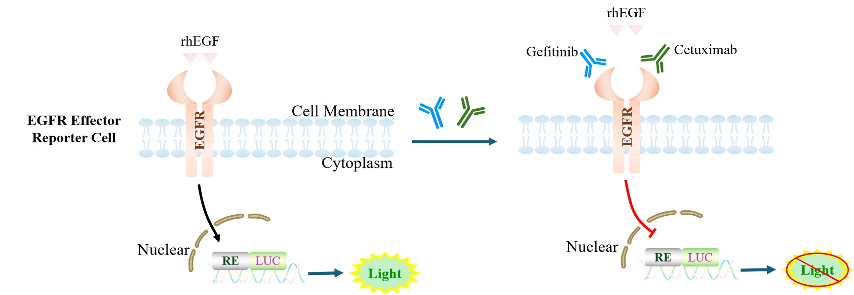 EGFR Effector Reporter Cell 報(bào)告基因藥靶模型很好的模擬了體內(nèi) EGFR 的信號(hào)轉(zhuǎn)導(dǎo)過(guò)程, 原理見(jiàn)下圖所示。