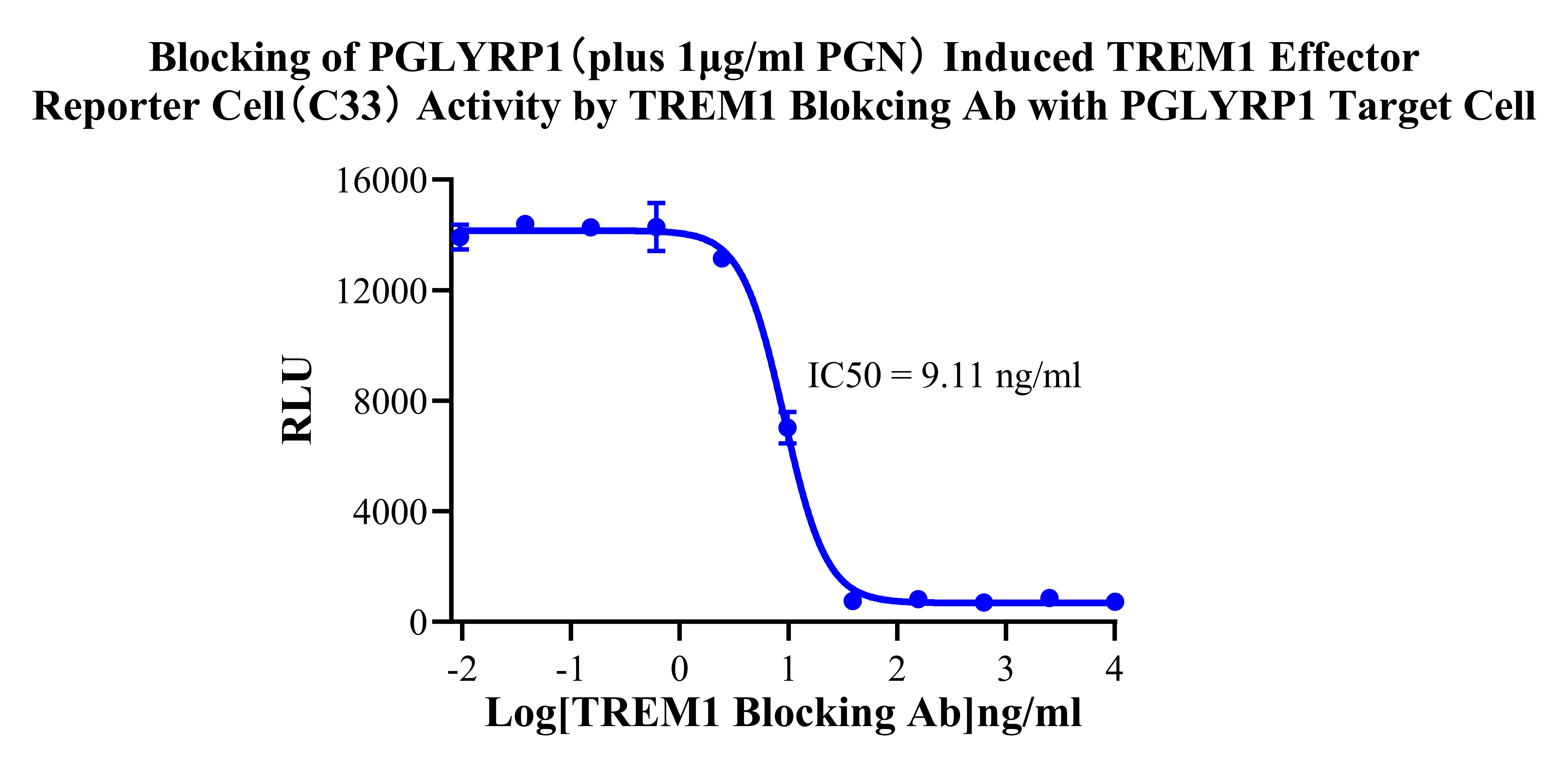 Figure 1. Blocking of PGLYRP1 (plus 1ug/ml PGN)induced TREM1 Effector Reporter Cell(C33) Activity by TREM1 Blokcing Ab with PGLYRP1 Target Cell . |