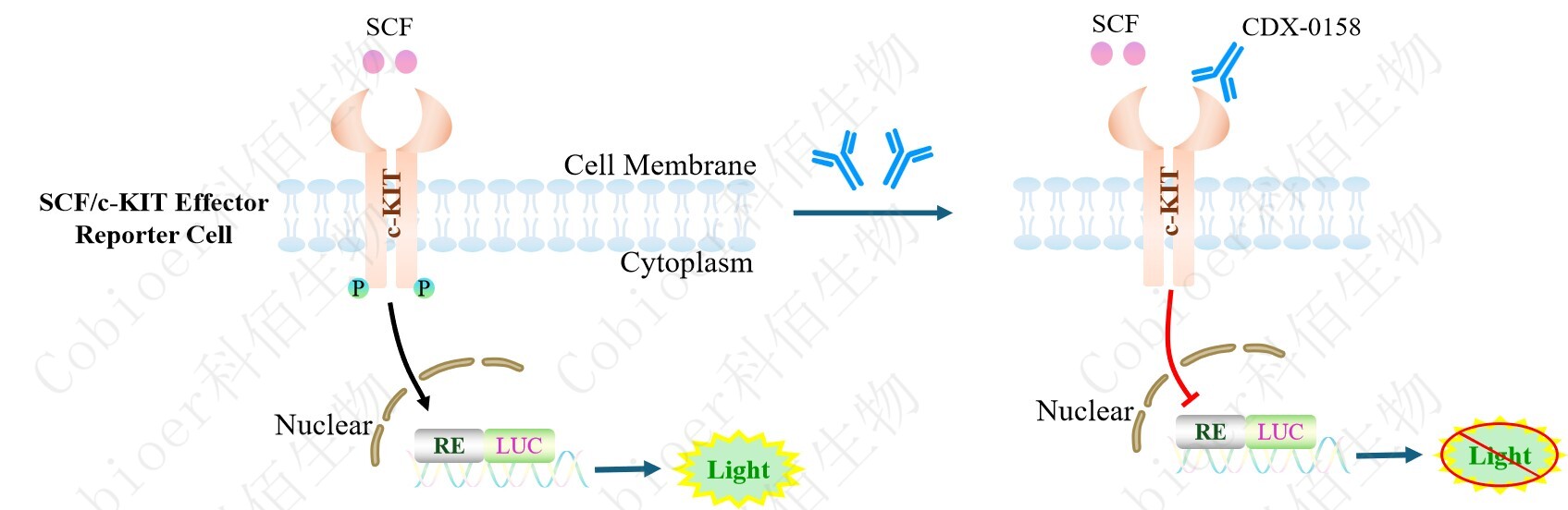SCF/c-KIT Effector Reporter Cell 報告基因藥靶模型很好的模擬了體內(nèi) SCF/c-KIT 的信號轉(zhuǎn)導過程,原理見下圖所示。