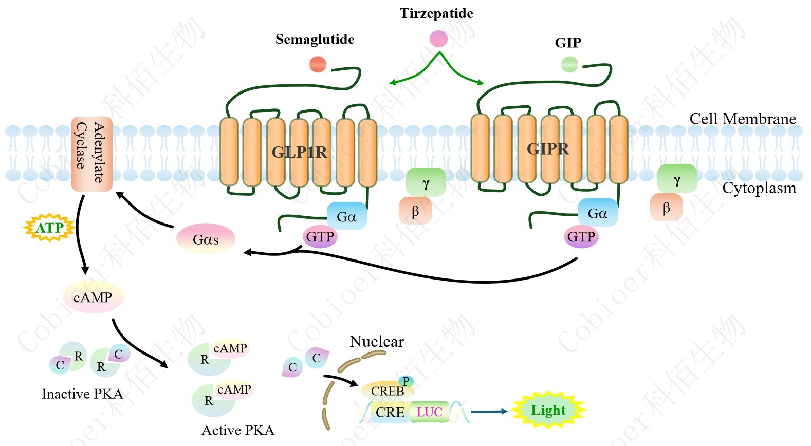 GLP1R&GIPR Dual Reporter Cell 報告基因藥靶模型很好的模擬了體內(nèi) GLP1R&GIPR的信號轉(zhuǎn)導(dǎo)過程,原理見下圖所示。