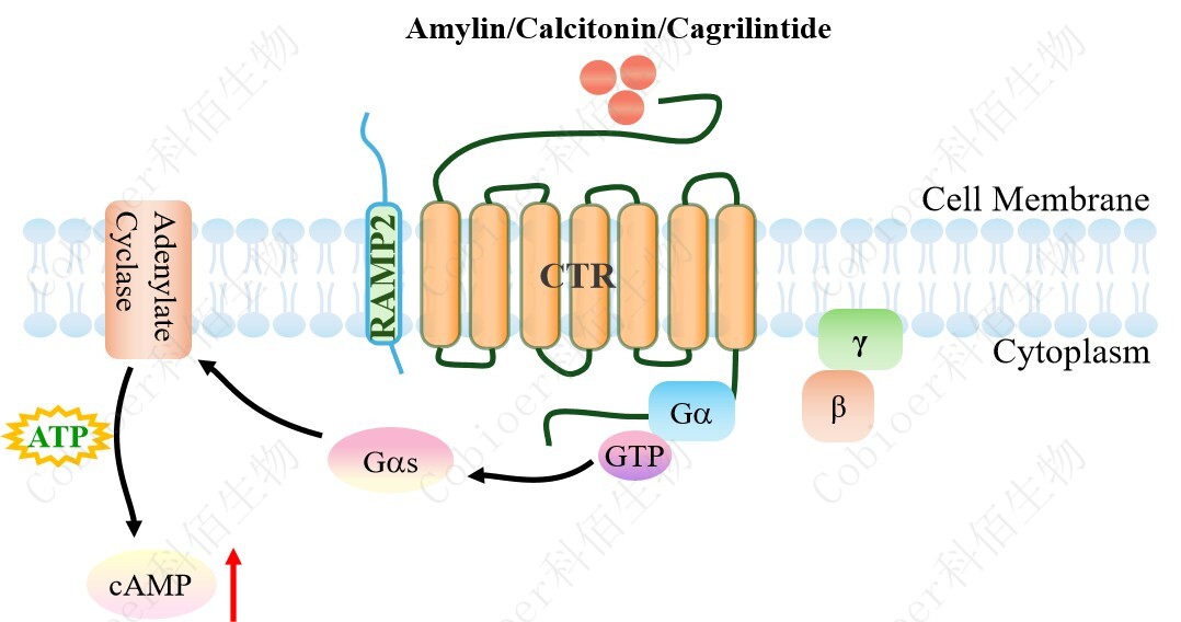 cAMP 在 G 蛋白偶聯(lián)受體(GPCR)信號轉導中是一種關鍵的第二信使。當配體結合 到 GPCR,構象發(fā)生變化,激活受體接著激活 G 蛋白,Gs 的激活導致腺苷酸環(huán)化酶調控 cAMP 的升高。