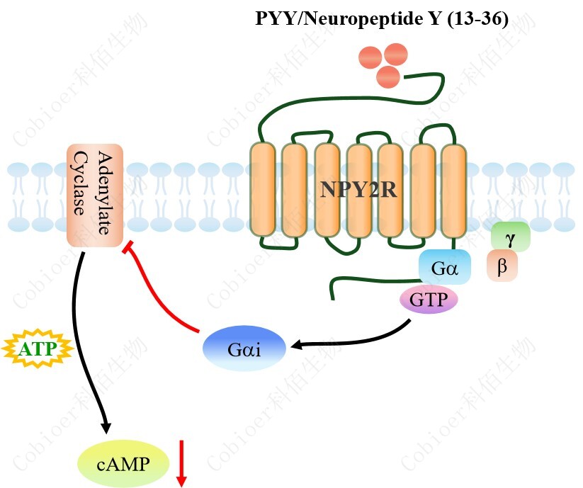 cAMP 在 G 蛋白偶聯(lián)受體(GPCR)信號轉(zhuǎn)導(dǎo)中是一種關(guān)鍵的第二信使。當(dāng)配體結(jié)合 到 GPCR,構(gòu)象發(fā)生變化,激活受體接著激活 G 蛋白,Gi 的激活導(dǎo)致腺苷酸環(huán)化酶調(diào)控 cAMP 的下調(diào)。NPY2R CHO 藥靶模型很好的模擬了體內(nèi) NPY2R 的信號轉(zhuǎn)導(dǎo)過程,原理見 下圖所示。