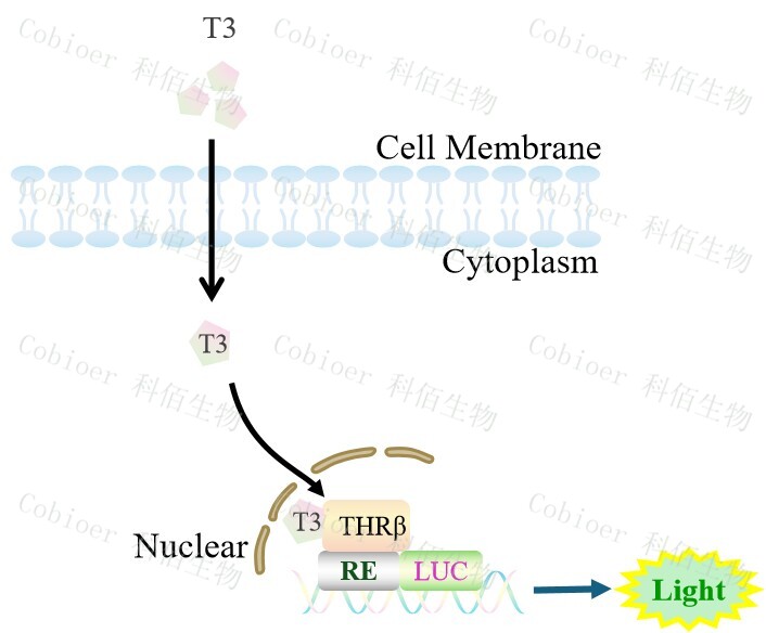 THRB Luciferase Reporter HEK293,是由 THRB 調(diào)控并表達(dá) Luc 熒光素 酶報(bào)告基因的 HEK293 細(xì)胞。甲狀腺激素(T3/T4)是一種有效的甲狀腺激素,主要通過(guò)結(jié) 合 TRs 發(fā)揮作用,調(diào)控基因表達(dá)和細(xì)胞功能,原理見(jiàn)下圖所示。![]() Figure 1. THRB Luciferase Reporter HEK293 原理示意圖