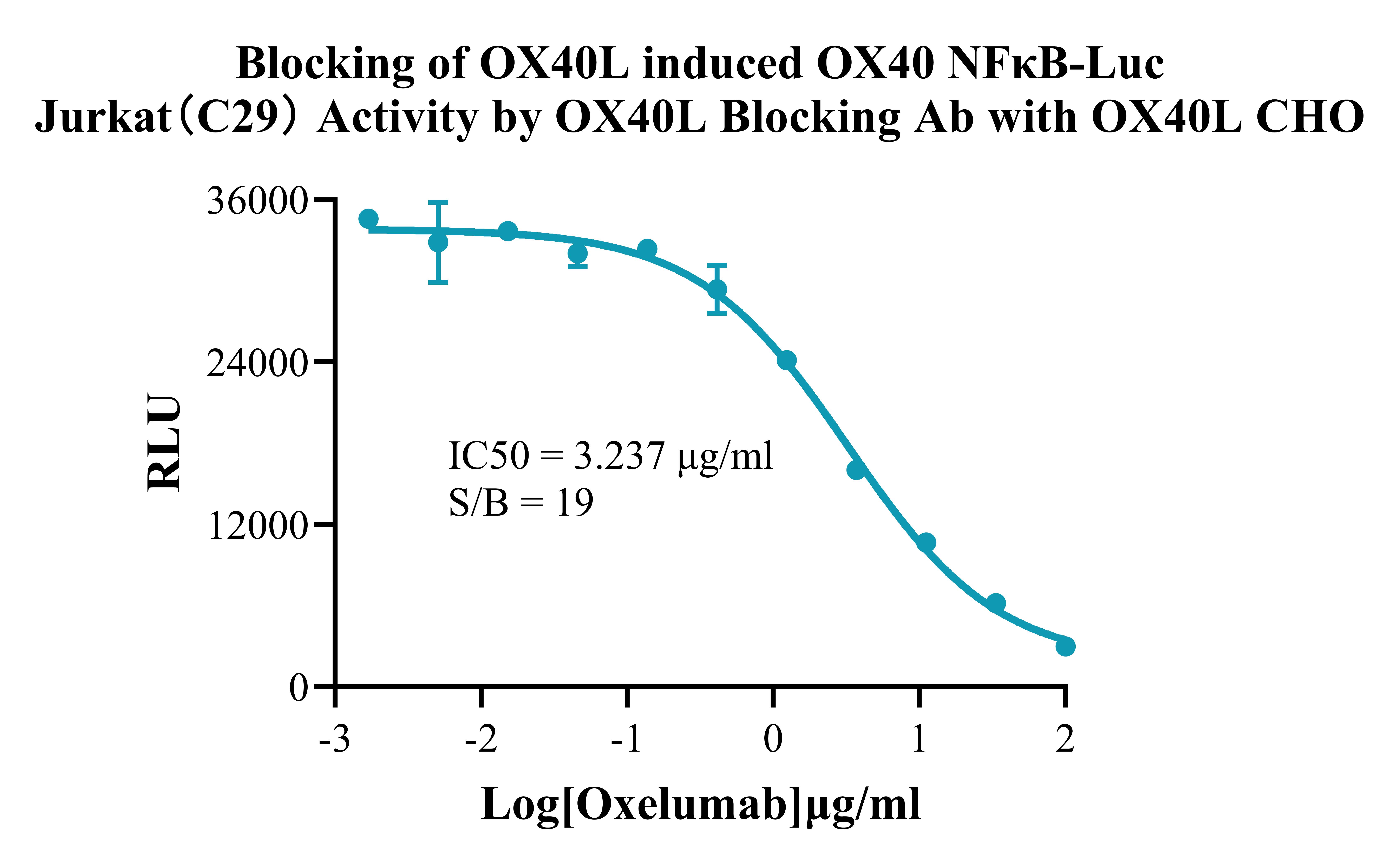 IV. Representative Data![]() Figure 1. Recombinant OX40L CHO stably expressing OX40L. ![]() Figure 2. Blocking of OX40L induced OX40 NFκB-Luc Jurkat(C29) Activity by OX40L Blocking Ab with OX40L CHO. |