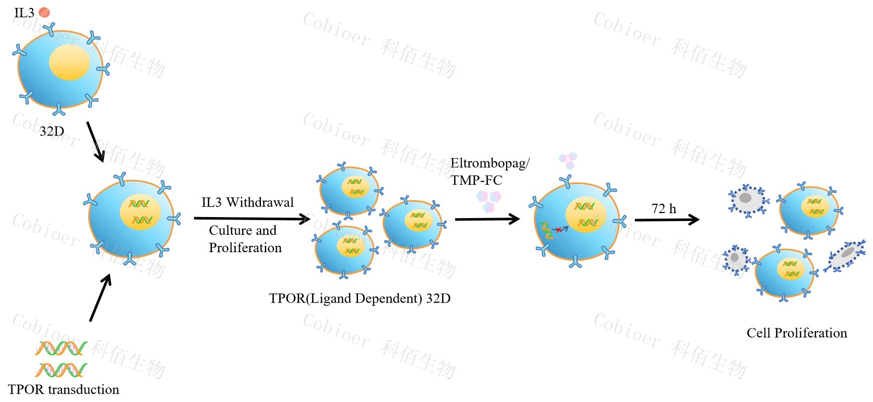 32D(小鼠原 B 細胞)的生長和增殖需要 IL-3 的維持。通過引入各種表達激酶的基因, 能作為 32D 的驅(qū)動基因,讓 32D 不再依賴 IL-3 而增殖,進而激酶基因成為 32D 增殖依賴 的驅(qū)動基因,用于評估小分子藥物對激酶的靶向抑制作用,原理及流程見下圖所示。 Figure 1. TPOR(Ligand Dependent) 32D 細胞模型原理圖 |