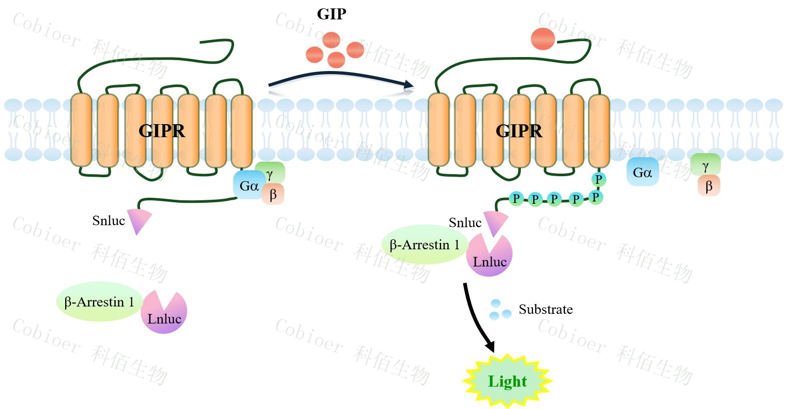GIPR β-Arrestin 1 CHO 報告基因藥靶模型很好的模擬了體內(nèi) GIPR/β-Arrestin 1 的信號 轉(zhuǎn)導過程,原理見下圖所示。當缺乏配體刺激時,β-Arrestin 1 不與 GIPR 結合,融合β- Arrestin 1 的熒光素酶處于失活構象,當 GIPR 遭遇配體刺激時,融合熒光素酶報告基因的 β-Arrestin 1 被招募,使熒光素酶報告基因處于激活狀態(tài),加入其底物后發(fā)光信號增強。![]() Figure 1. GIPR β-Arrestin 1 CHO 細胞模型原理圖 |