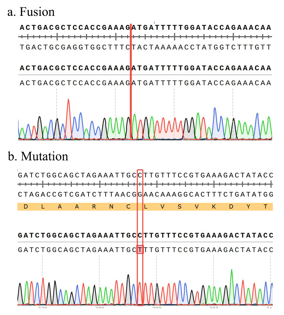 1.WB of CD74-ROS1 [L2086F] BaF3 Figure 2. WB of CD74-ROS1 [L2086F] BaF3. 2.Sanger of CD74-ROS1 [L2086F] BaF3 |