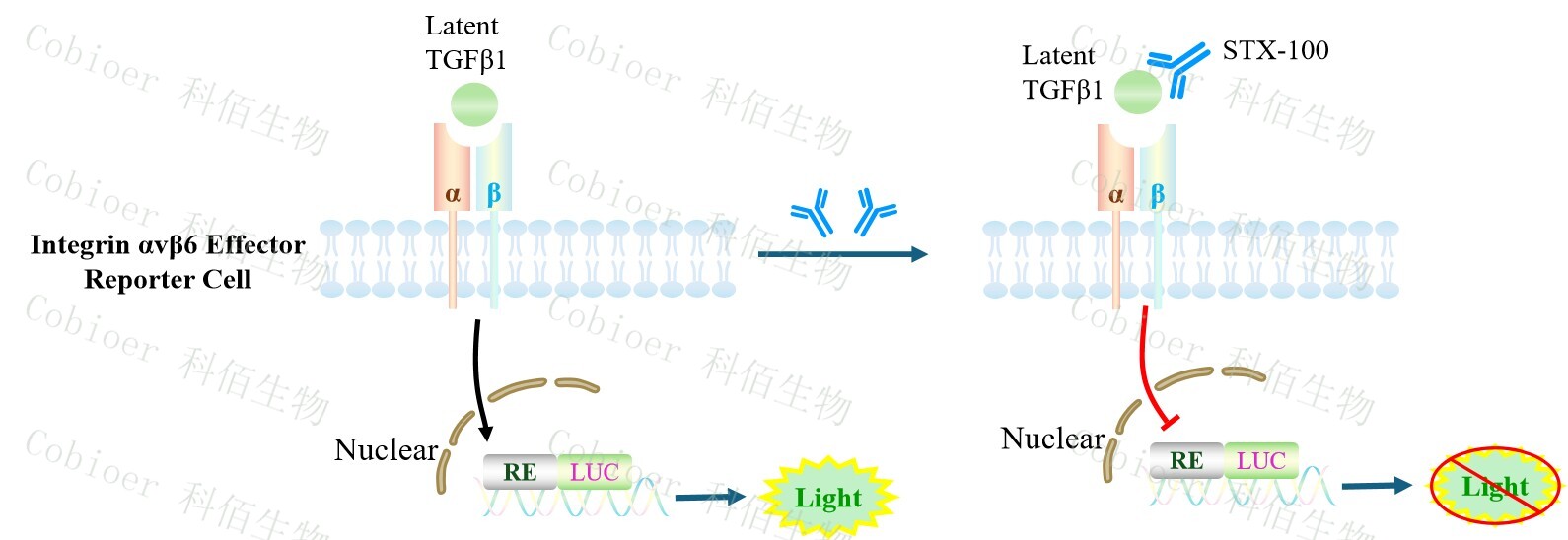 Integrin αvβ6 Effector Reporter Cell 報(bào)告基因藥靶模型很好的模擬了體內(nèi)αvβ6 的信號轉(zhuǎn) 導(dǎo)過程,原理見下圖所示。