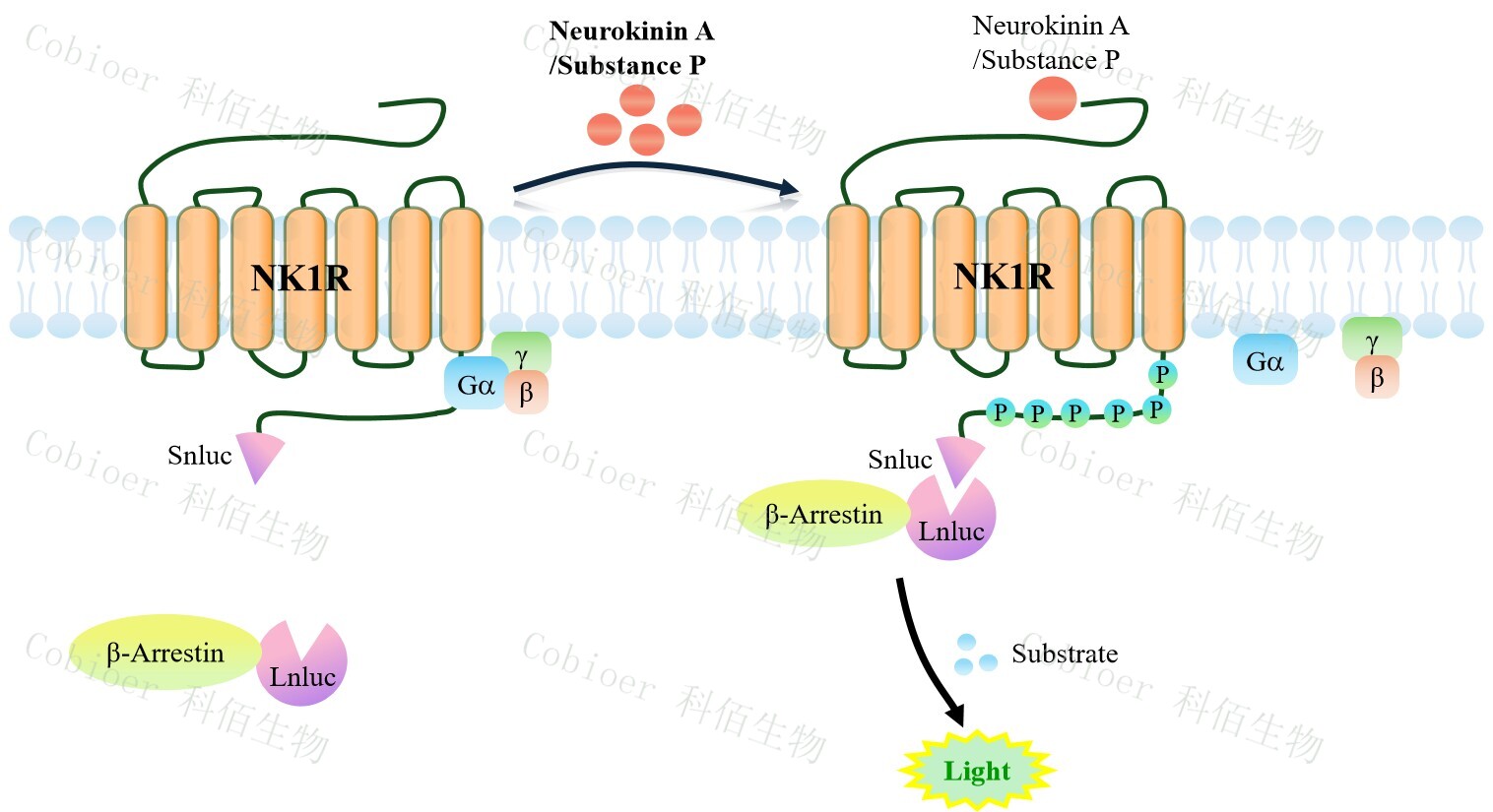 NK1R β-Arrestin CHO 報告基因藥靶模型很好的模擬了體內(nèi) NK1R/β-Arrestin 的信號轉(zhuǎn) 導(dǎo)過程,原理見下圖所示。當(dāng)缺乏配體刺激時,β-Arrestin 不與 NK1R 結(jié)合,融合β-Arrestin的熒光素酶處于失活構(gòu)象,當(dāng) NK1R 遭遇配體刺激時,融合熒光素酶報告基因的β-Arrestin 被招募,使熒光素酶報告基因處于激活狀態(tài),加入其底物后發(fā)光信號增強。![]() Figure 1. NK1R β-Arrestin CHO 細胞模型原理圖 |