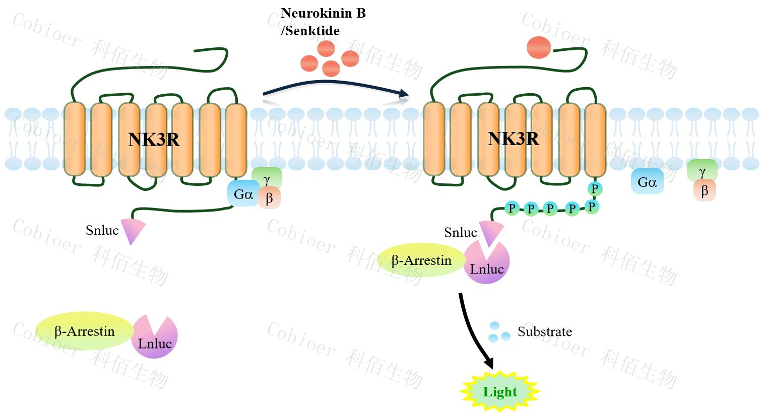 NK3R β-Arrestin CHO 報(bào)告基因藥靶模型很好的模擬了體內(nèi) NK3R/β-Arrestin 的信號(hào)轉(zhuǎn) 導(dǎo)過程,原理見下圖所示。當(dāng)缺乏配體刺激時(shí),β-Arrestin 不與 NK3R 結(jié)合,融合β-Arrestin 的熒光素酶處于失活構(gòu)象,當(dāng) NK2R 遭遇配體刺激時(shí),融合熒光素酶報(bào)告基因的β-Arrestin 被招募,使熒光素酶報(bào)告基因處于激活狀態(tài),加入其底物后發(fā)光信號(hào)增強(qiáng)。![]() Figure 1. NK3R β-Arrestin CHO 細(xì)胞模型原理圖 |