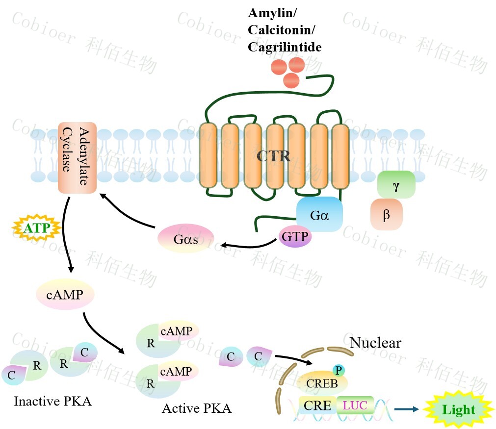 CTR CRE-Luc CHO 報告基因藥靶模型很好的模擬了體內(nèi) CTR 的信號轉(zhuǎn)導過程,原理見下圖所示。![]() Figure 1. CTR CRE-Luc CHO 細胞模型原理圖 |