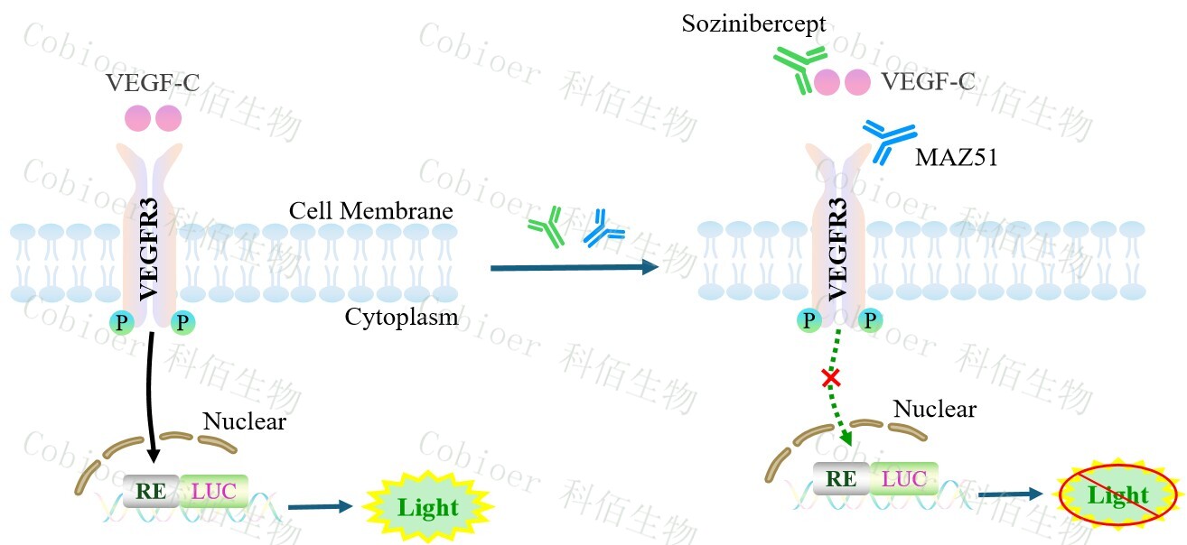 VEGFC/VEGFR3 Effector Reporter Cell 報(bào)告基因藥靶模型很好的模擬了體內(nèi) VEGFC/VEGFR3 的信號轉(zhuǎn)導(dǎo)過程,原理見下圖所示。![]() Figure 1. VEGFC/VEGFR3 Effector Reporter Cell 細(xì)胞模型原理圖 |